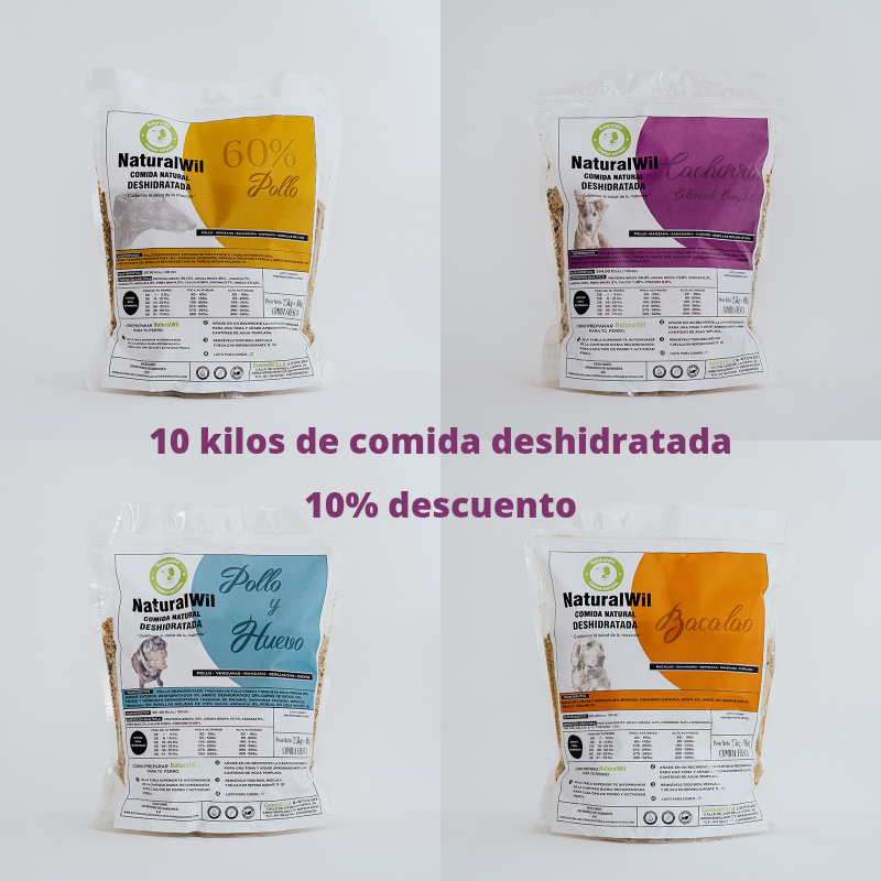 Elige esta opción si quieres tener el 10% de descuento en tu pedido de 4 bolsas grandes de comida natural deshidratada para perros y gatos.