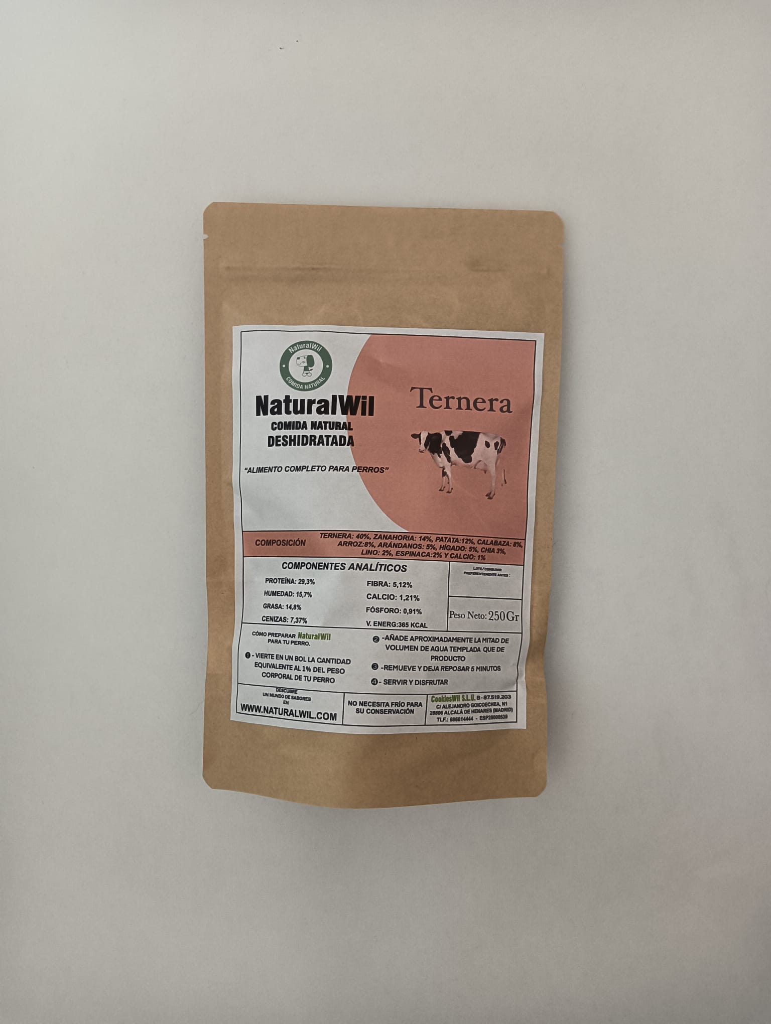 Alimento completo deshidratado 100% natural para todo tipo de perros, cuyo ingrediente principal es la carne de ternera en trocitos, y sin ningún aditivo añadido.