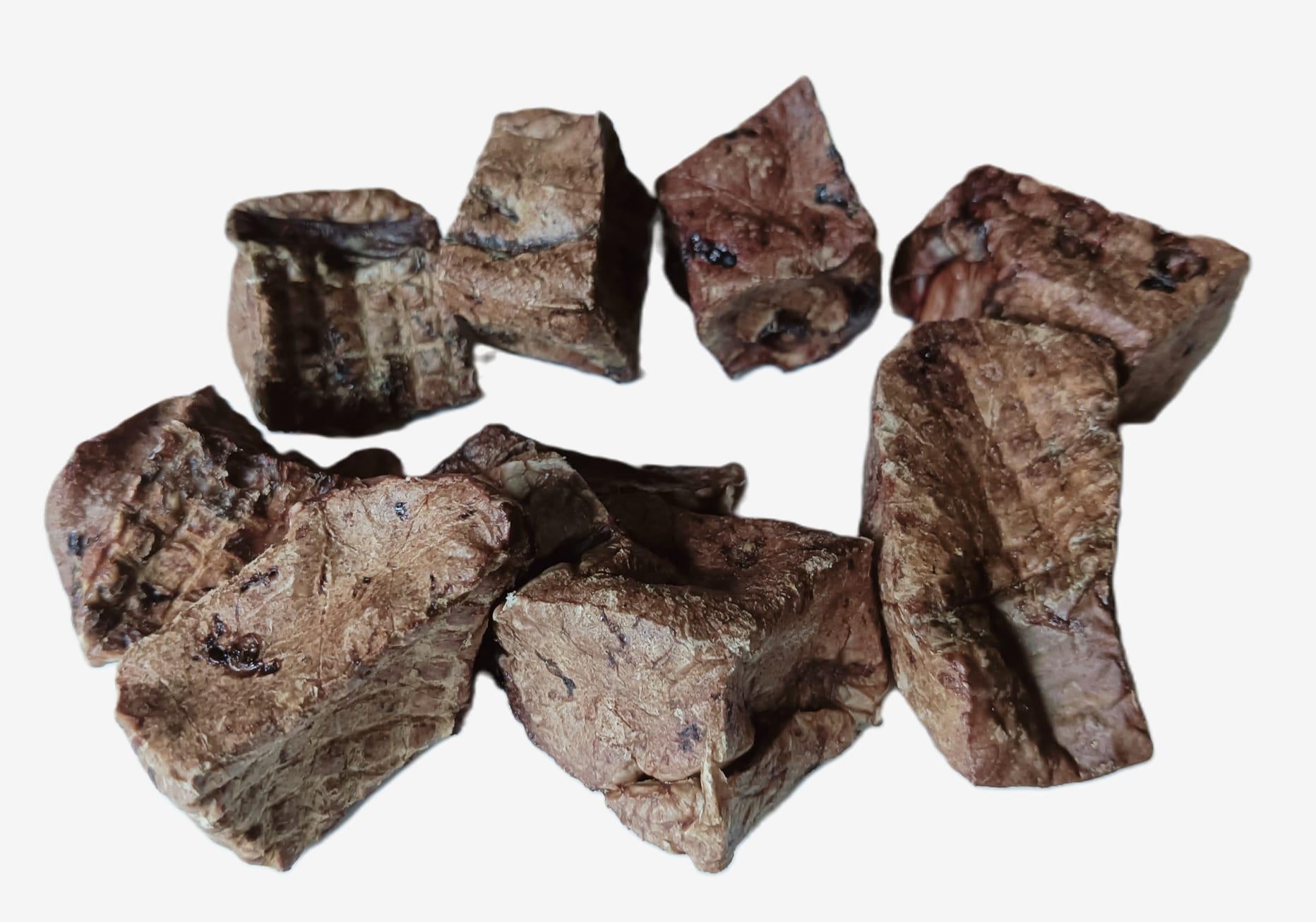 Trocitos pequeños de pulmón, por lo que se puede dar como premio, para hacer juegos de olfato o entrenamientos. Cada trocito mide entre 1 y 2 cm.